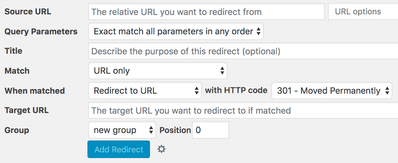 Dans sa forme la plus élémentaire, vous devez entrer une URL source (l’URL à partir de laquelle vous redirigez) et une URL cible (l’URL vers laquelle vous redirigez).