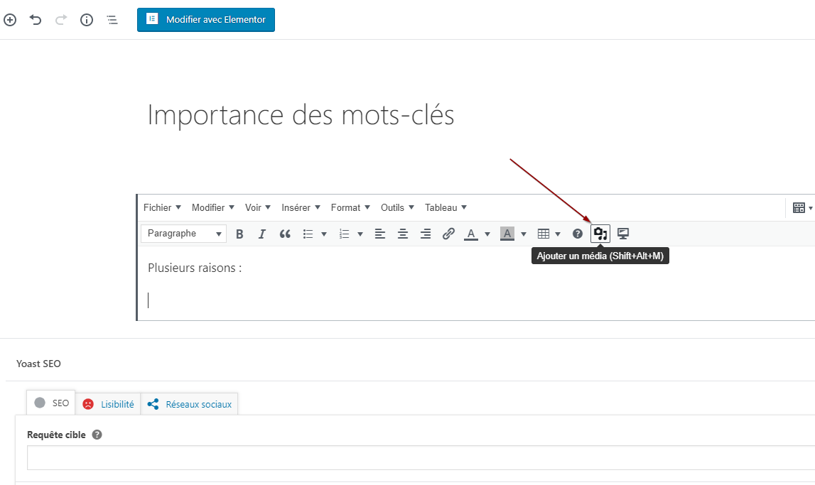 Pour insérer une image, cliquez sur l’icone “Ajouter un média” et vous accédez alors à la bibliothèque de médias.