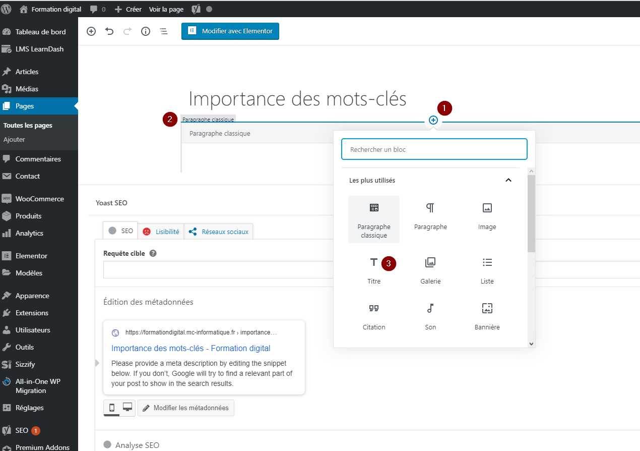 Saisissez (2) un titre (par défaut, il sera repris dans le permalien). Si le titre du permalien n’est pas optimisé pour votre référencement, (3) pensez à le modifier (entre 2 et 3 mots clés maximum, séparés par des tirets et sans accent).