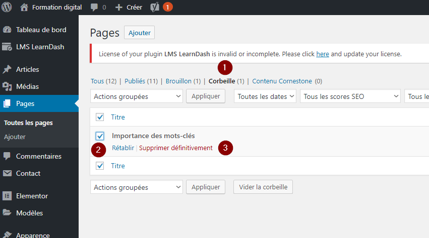 Les pages mises à la corbeille peuvent être récupérées en (1) cliquant sur le lien corbeille. Sélectionnez la page et (2) cliquez sur le lien Rétablir. Dans le cas contraire, on peut la (3) supprimer définitivement.